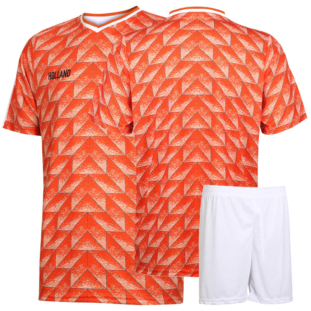 Entrez sur le terrain et imaginez-vous dans la légendaire finale du Championnat d'Europe 1988, où Ruud Gullit et Marco van Basten ont écrit l'histoire. Le maillot de football est décoré d'un motif graphique unique et du logo caractéristique du lion noir, tandis que le short assorti est blanc avec un lion noir. En option, des chaussettes orange sont disponibles avec le même fier emblème du lion. Fabriquée à 100 % en polyester de haute qualité, cette tenue offre un confort et une ventilation ultimes grâce à la structure en maille fine. La tenue des couleurs est garantie, même après des lavages répétés, afin que votre tenue reste toujours éclatante. Disponible en tailles enfant et adulte.