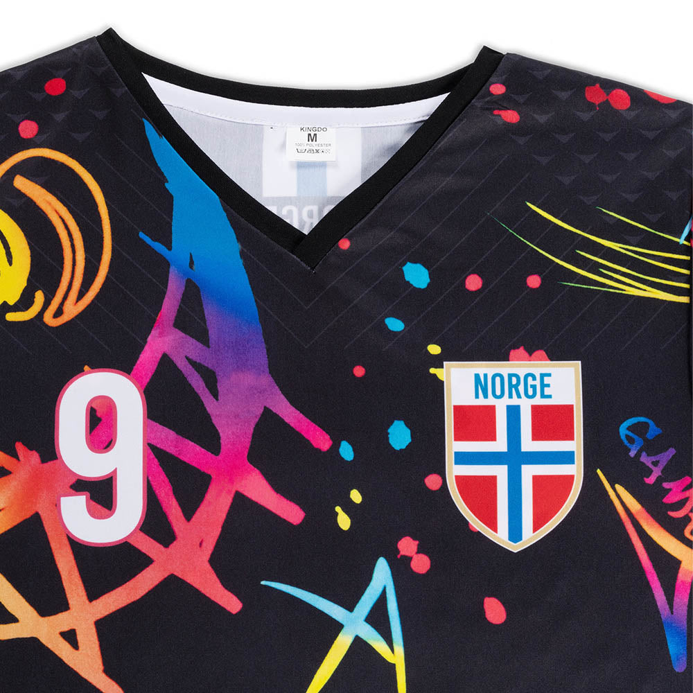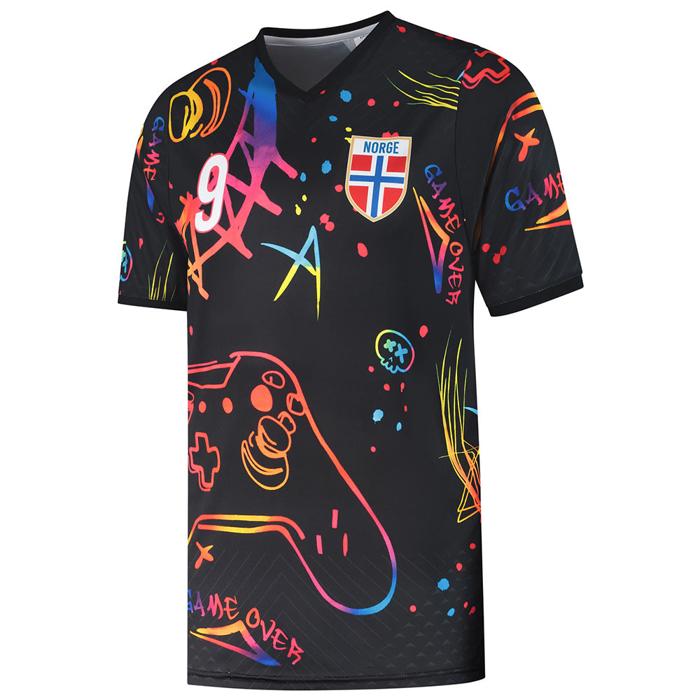 Démarquez-vous avec style grâce à ce spectaculaire tenue de football Norvège Haaland – Gaming Edition ! Cet ensemble unique combine sport et gaming dans un design remarquable, avec des graphismes colorés et le nom HAALAND avec le numéro 9 dans le dos. Parfait pour les fans du buteur norvégien et les amateurs de gaming.
