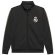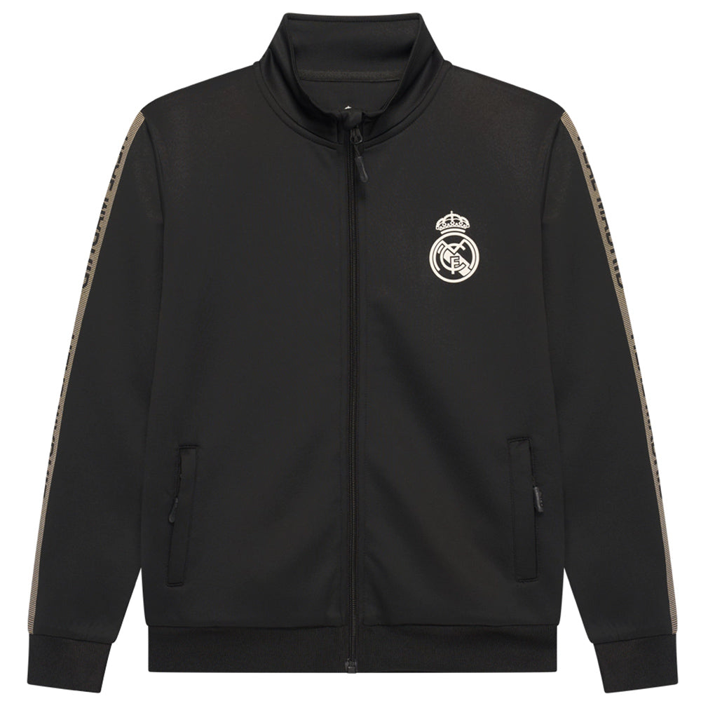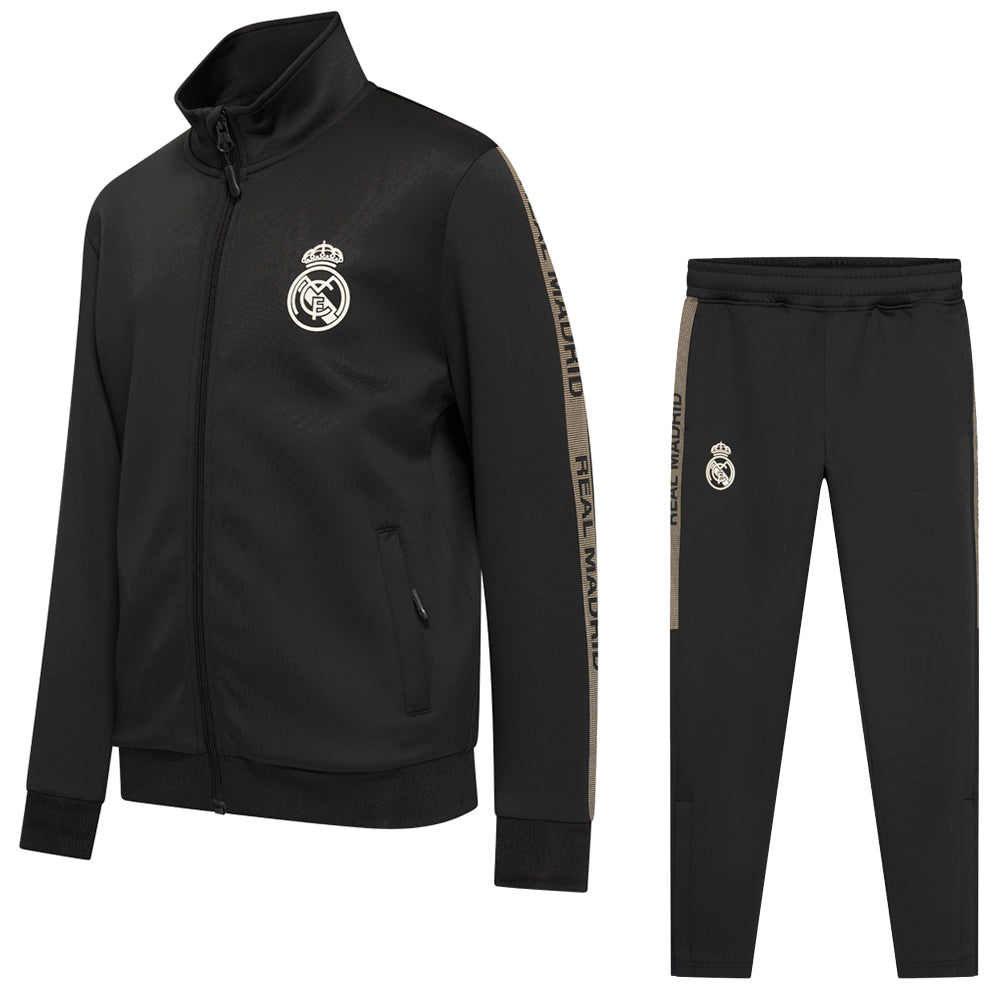 De set bestaat uit een sportief jack met rits en een bijpassende broek, beide voorzien van het officiële Real Madrid-logo en luxe afwerkingen langs de mouwen en broekspijpen. Dankzij de ademende en flexibele stof biedt dit pak optimaal comfort en bewegingsvrijheid – perfect voor zowel sport als vrije tijd.