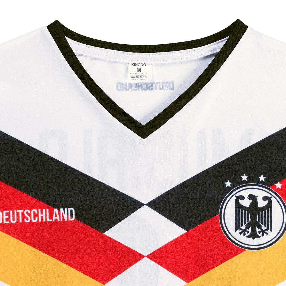 De stof voelt licht, soepel en ademend aan, waardoor je er heerlijk in kunt voetballen, trainen of gewoon lekker in kunt rondlopen. Zelfs na veel wassen blijven de kleuren mooi. Geschikt voor jong en oud - dus perfect om samen in Duitsland-stijl te schitteren.